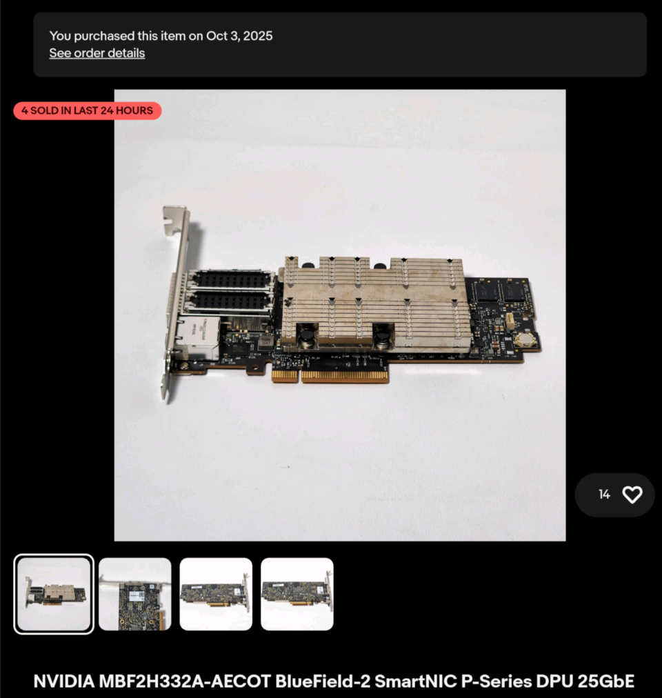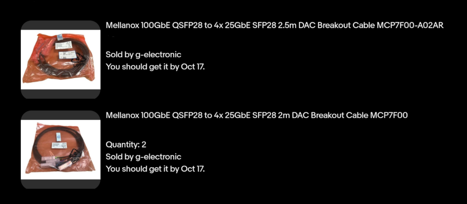 In preparation for a hardware refresh and much needed colocation visit, I've ordered additional Mellanox DPUs. Those require a few additional cables to augment the existing hardware stockpile. I already have some 100G to 4x 25G breakouts, but not enough, and not in the correct lengths. Yay for ebay, all acquired for under $100 as "new old stock".