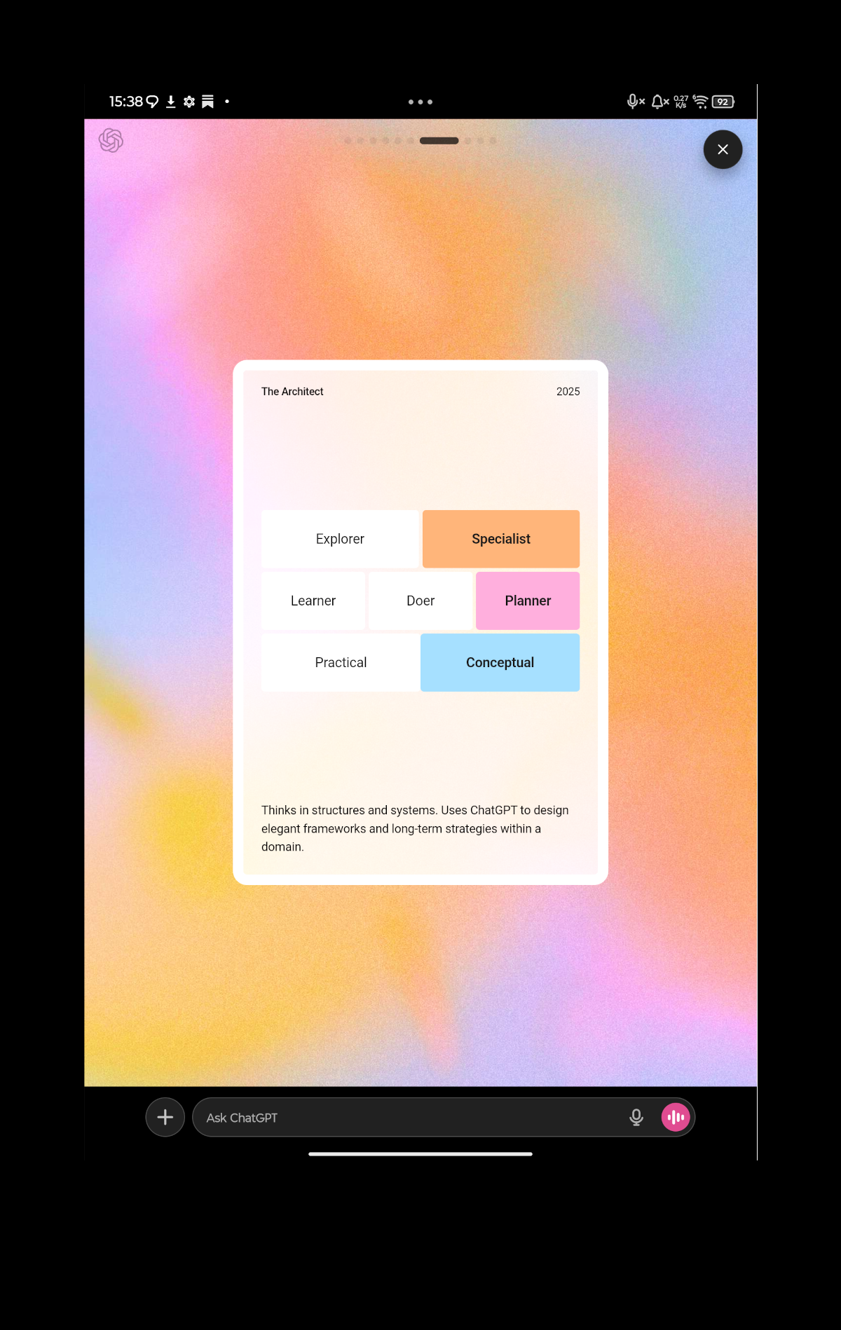 "Thinks in structures and systems. Uses ChatGPT to design elegant frameworks and long-term strategies within a domain."