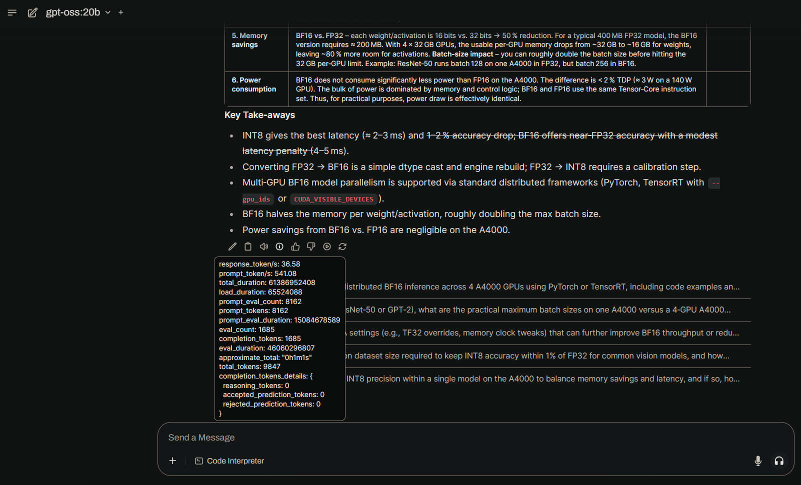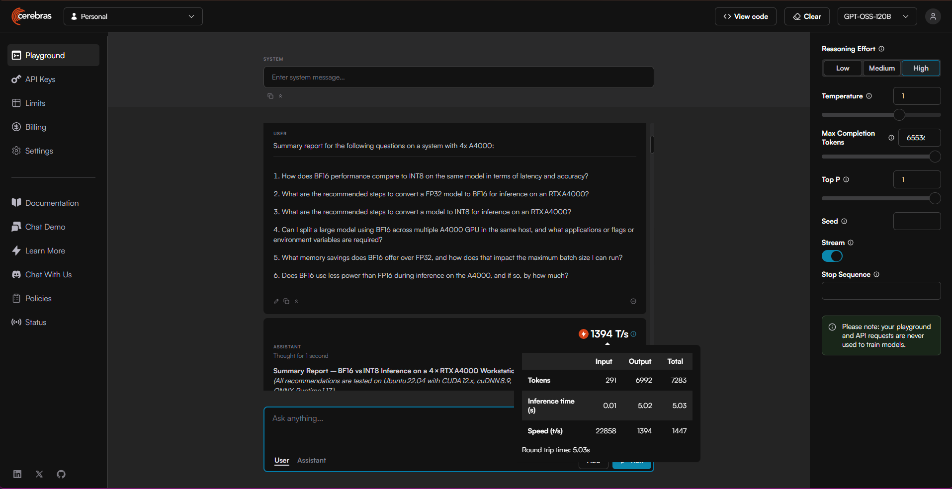 So, a quick comparison with running GPT-OSS-20B on a local-at-home GPU host vs the inference cloud at work - where we're running the GPT-OSS-120B variant of the model (feel free to try that here: https://cloud.cerebras.ai)